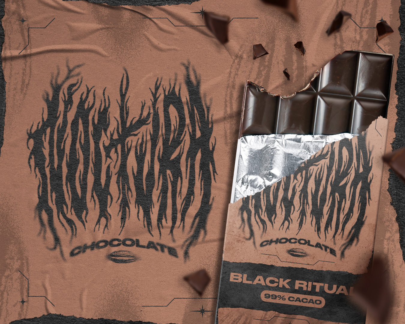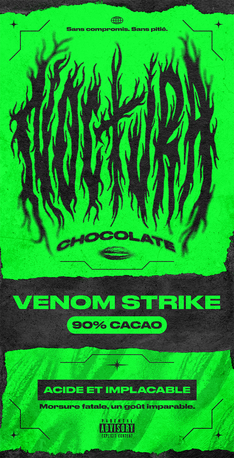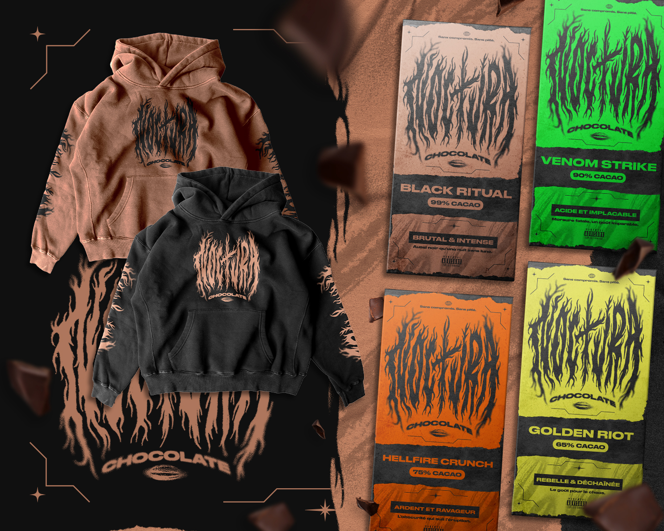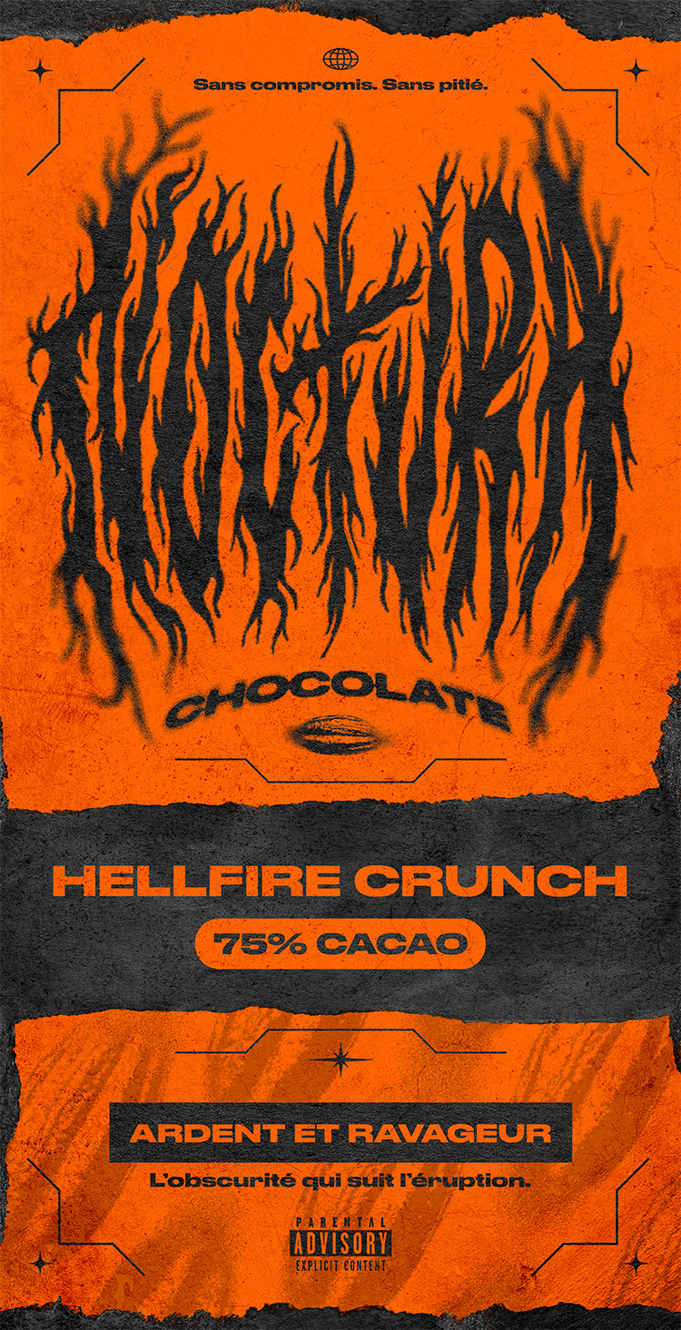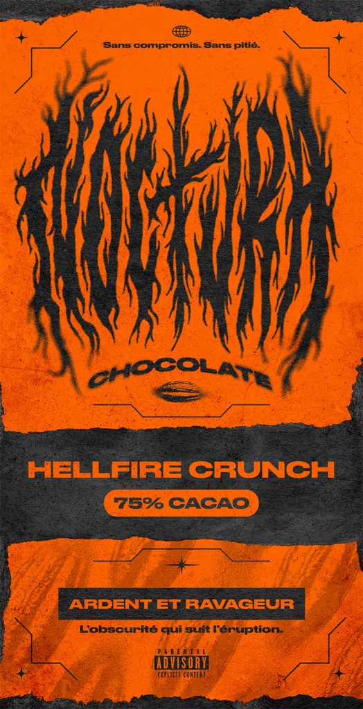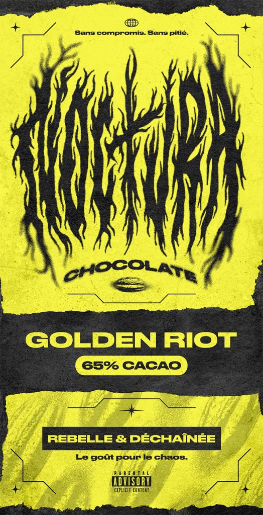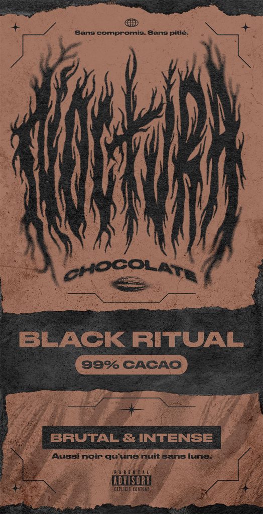 Ce projet imagine une identité visuelle pour Noctura Chocolat— une marque inspirée par l’énergie brute d’un groupe de metal et l’intensité profonde, sans compromis, d’un chocolat noir.