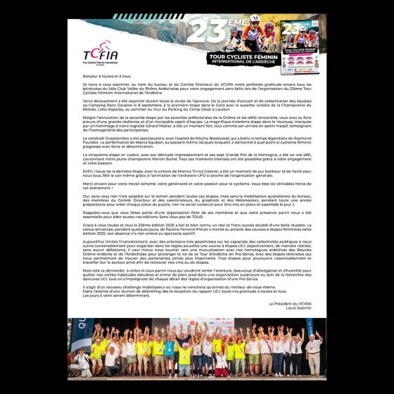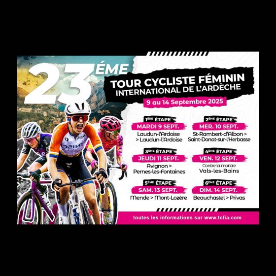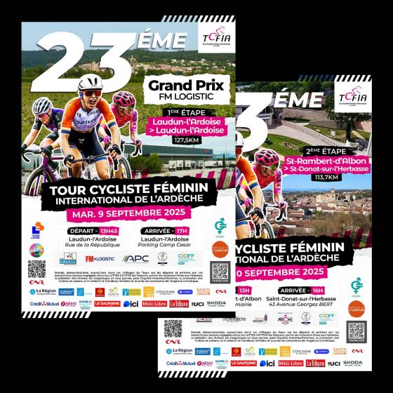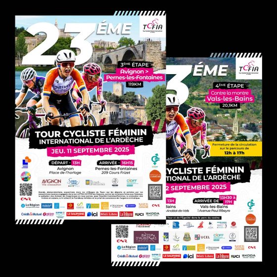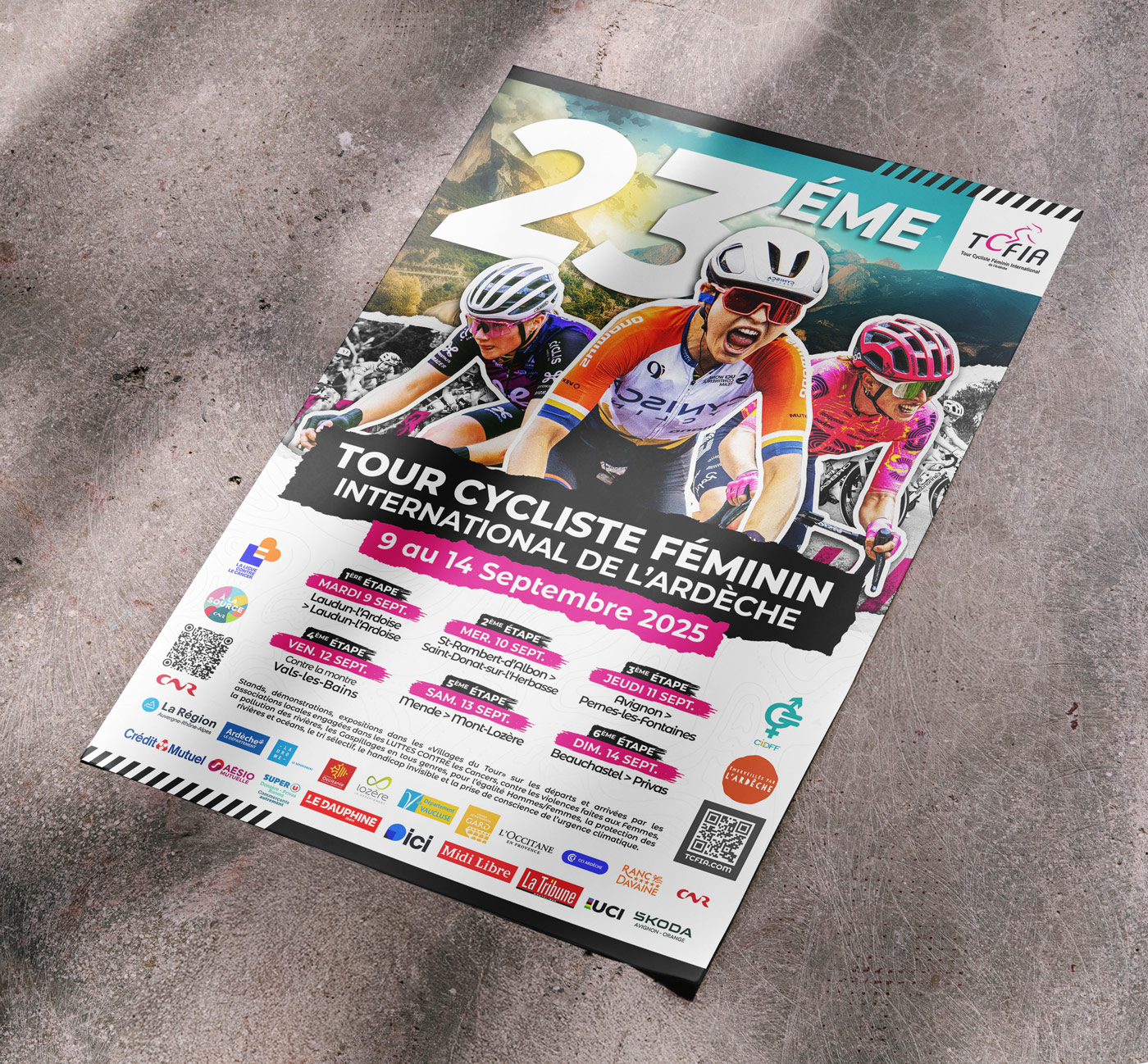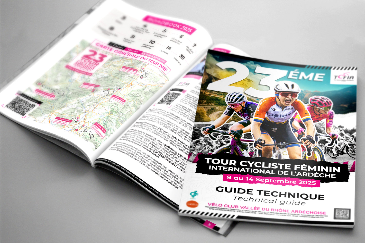 Création de l’affiche et mise en page du guide technique du TCFIA – 23ème édition. Cette course par étapes figure parmi les plus montagneuses du calendrier féminin. Ce projet me permet de célébrer la passion, l’effort et l’excellence du cyclisme féminin. De plus, il me donne l’occasion de promouvoir les paysages montagneux magnifiques de l’Ardèche. Voir le site.
